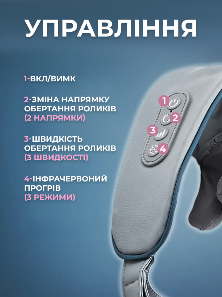 4 кнопки для повного контролю: вмикання, зміна напрямку роликів, швидкість масажу (3 рівні), інфрачервоний прогрів (3 режими). Все просто і інтуїтивно. -